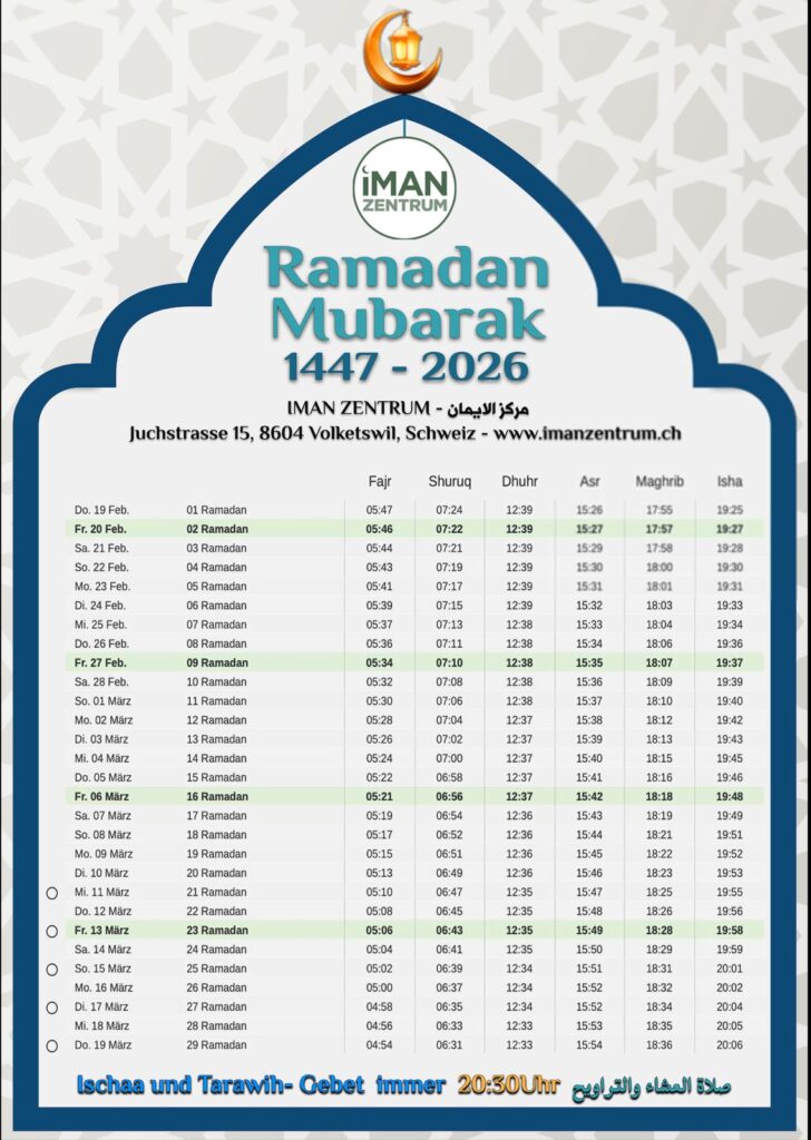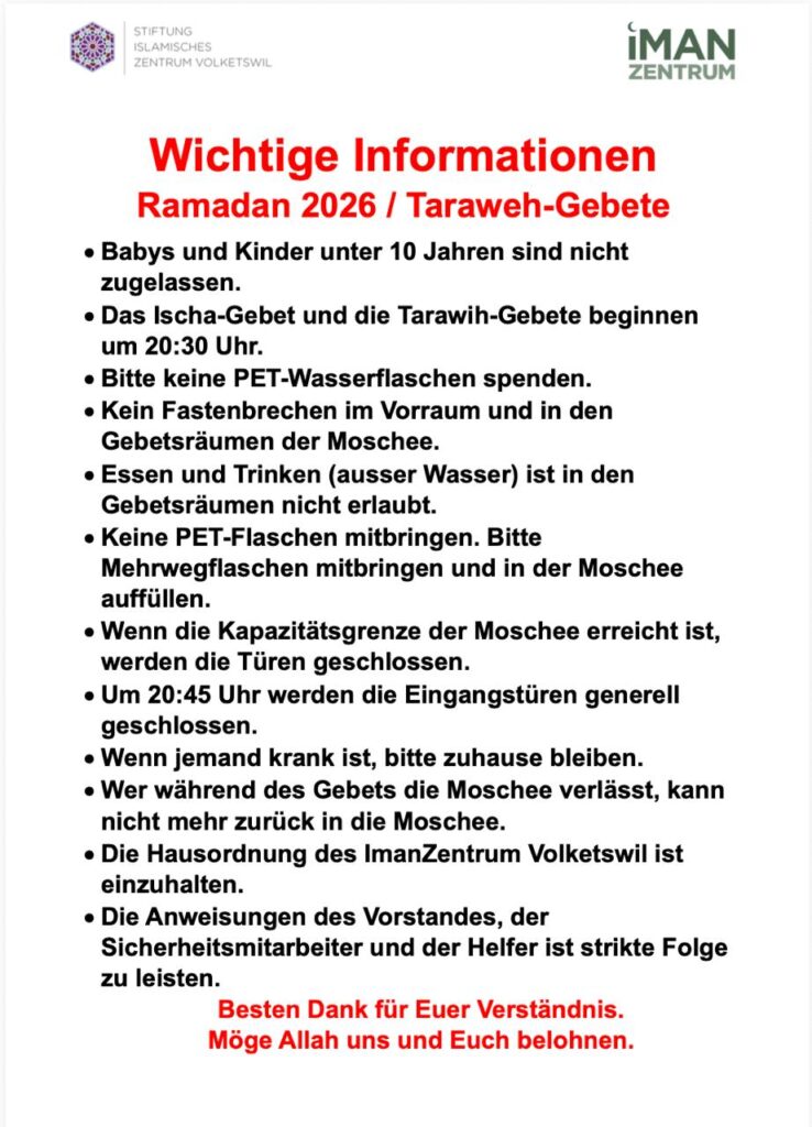 Wir heissen Sie herzlich willkommen auf der Webseite unseres Iman Zentrums, das als zentrale Anlaufstelle für Gebet und Gemeinschaft für Muslime aus allen Ländern und Regionen dient. Um den Bedürfnissen unserer vielfältigen Gemeinschaft gerecht zu werden, haben wir Deutsch und Arabisch als primäre Kommunikationssprache festgelegt. Deutsch wird verwendet, da unser Zentrum in der deutschsprachigen Schweiz ansässig ist, während Arabisch aufgrund seiner essenziellen Bedeutung als Sprache des Korans eine wesentliche Rolle einnimmt.